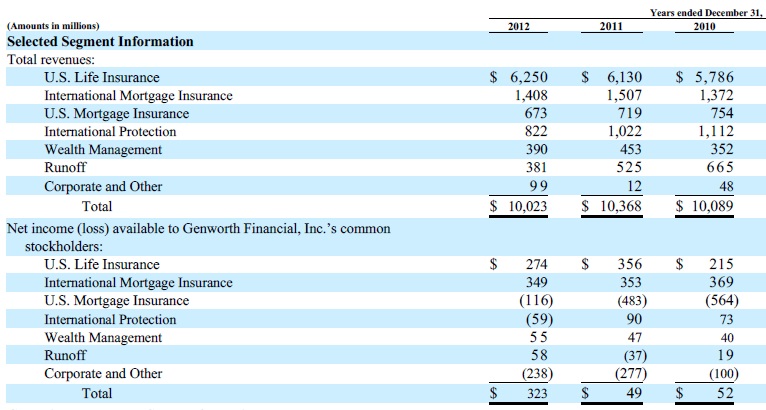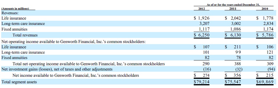 Will all these changes make LTC a more profitable product for GNW? LTC insurance is reported under the U.S. Life Insurance segment. As indicated in the following two charts from GNW’s 2012 10K, LTC contributed 28-32% of total company revenues in the past three years. It accounted for 31% of net income in 2012. Unfortunately, the net operating margin on this product was only 4.3% in 2010, 3.3% in 2011, and 3.2% in 2012.