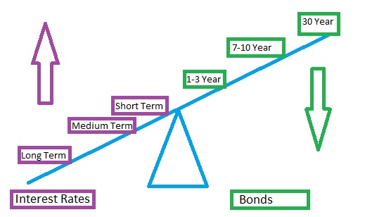 This means that as interest rates go up, long term bond prices will go down the most. Medium and shorter term bonds, which are nearer the fulcrum of the seesaw, will go down less.