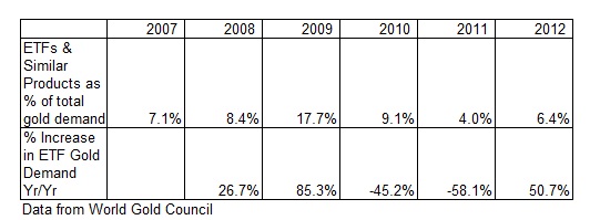 Following the 2008 financial crisis, investors rushed into gold as a safe haven in an uncertain world, primarily through gold-backed exchange traded funds (ETFs), which were first introduced in 2003. According to the World Gold Council, although total gold demand in 2009 decreased 11% to 3,385.8 tons as rising prices depressed jewelry and industrial demand, investment demand showed strong gains. ETF demand increased 85% to 594.7 tons, representing 17.6% of total gold demand. ETFs had represented only 7.1% of gold demand in 2007 and 8.4% of in 2008.