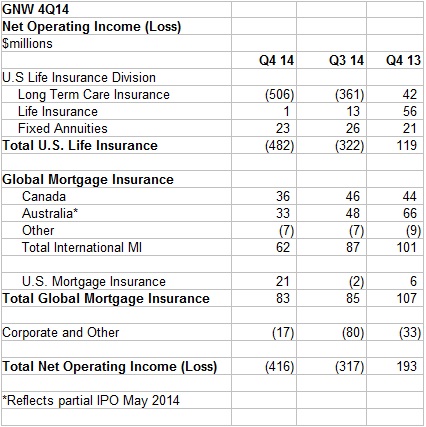 Genworth reported a 4Q14 operating loss of $416 million, or $0.84 per diluted share, below analysts’ consensus estimates of a loss of $0.13. This compares to a net operating loss of $0.64 per share in 3Q14, and a net operating profit of $0.38 per share in 4Q13.