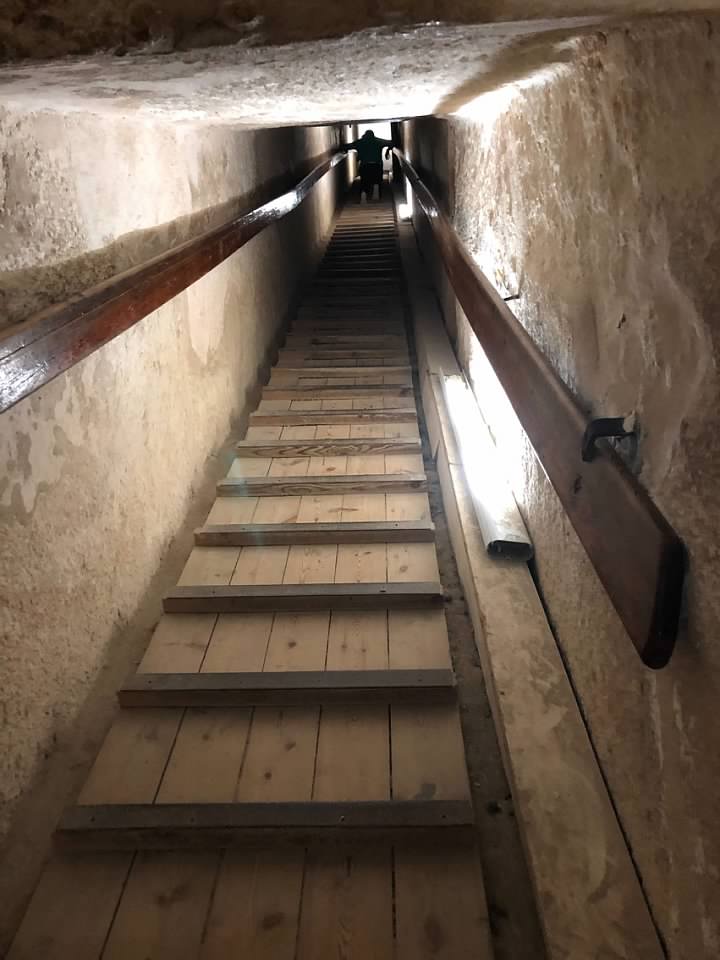 We went inside Khafre’s tomb, the second largest. You have to crouch low to go down a long, narrow tunnel of steep steps, which leads to an inner chamber tall enough to stand in. Then another long, low tunnel leads upward to the burial chamber, which is about 46’ by 16’.