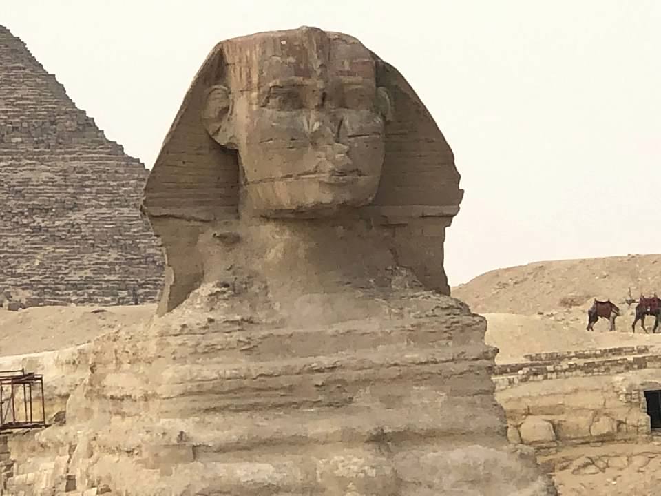 The Great Sphinx is located at this same complex. It’s a limestone statue of a mythical creature with the head of a human (supposedly Pharoah Khafre) and the body of a lion.