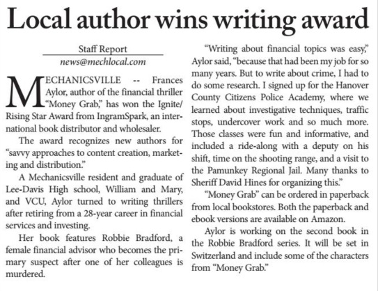 Frances Aylor loves mysteries, travel and finance. She is the author of Money Grab, a thriller, which won the Ingram Spark Ignite/Rising Star Award. Her short stories have been published in several anthologies, including Deadly Southern Charm and Malice Domestic: Mystery Most Theatrical. A member of International Thriller Writers and Sisters in Crime (SinC), she is currently president of the SinC – Central Virginia chapter.